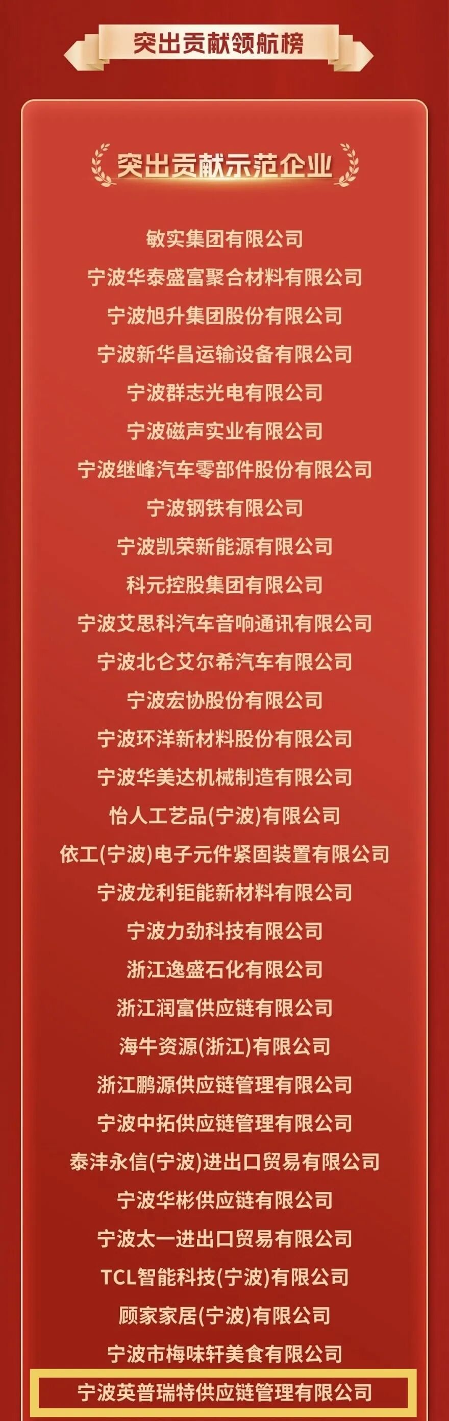 3 月 29 日,“潮涌东方看北仑” 2026 年北仑区经济高质量发展大会隆重举行,大会重磅发布 5 大领航榜单,140 家企业(单位)获表彰。宁波英普瑞特供应链管理有限公司凭借在人力资源服务领域的扎实耕耘与突出贡献,荣膺突出贡献领航榜・突出贡献示范企业榜单,斩获区域经济高质量发展重要荣誉!